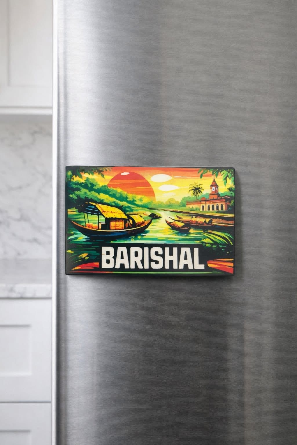 A vibrant acrylic fridge magnet showcasing the scenic beauty of Barishal’s riverside sunset. Durable, stylish, and perfect as a souvenir or gift.