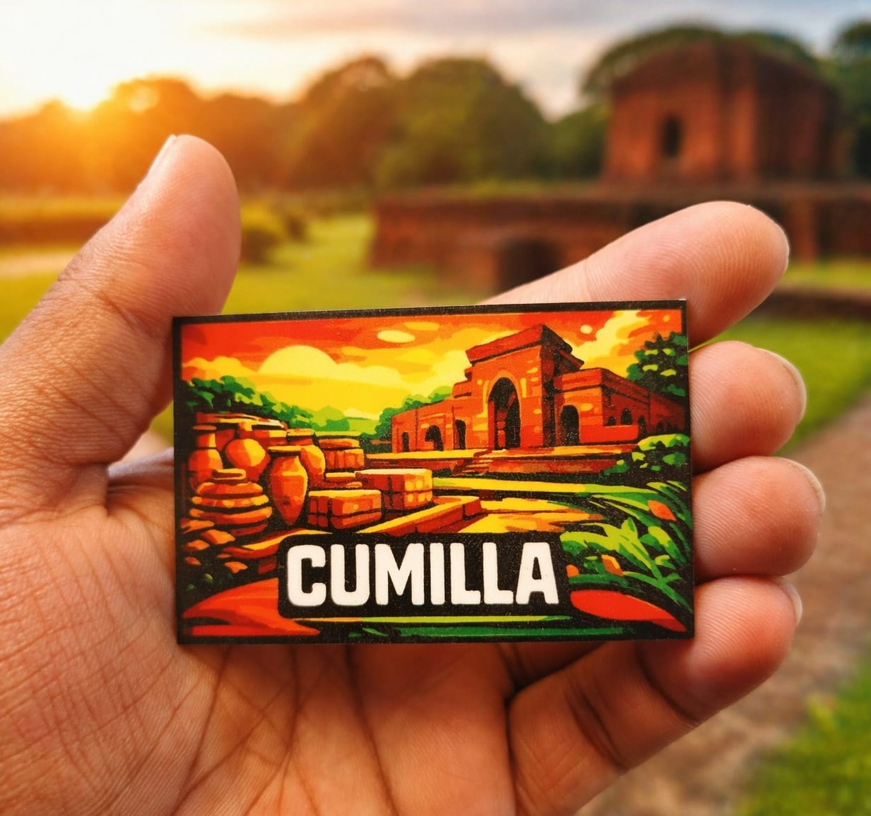 Celebrate the rich history and timeless beauty of Cumilla with the Cumilla Heritage Acrylic Magnet—a stunning keepsake inspired by the region’s iconic archaeological landmarks. Featuring a vibrant illustration reminiscent of the famous Shalban Vihara, this magnet captures the essence of ancient Bengal with warm sunset tones and intricate architectural details.